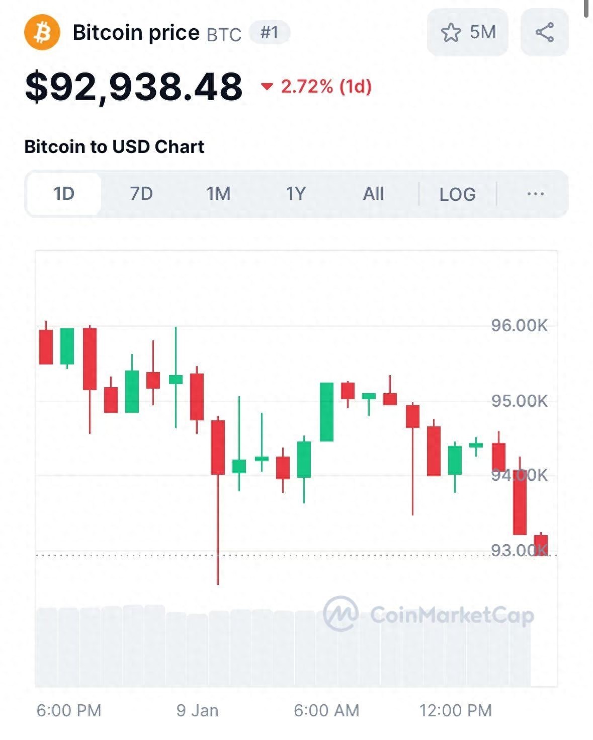 北京时间1月9日午后,虚拟货币市场迎来抛售潮,比特币价格大跌。截至记者发稿时,比特币跌破9.3万美元整数关口,暂报92938美元/枚,日内跌幅达2.7%。